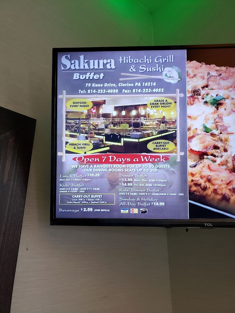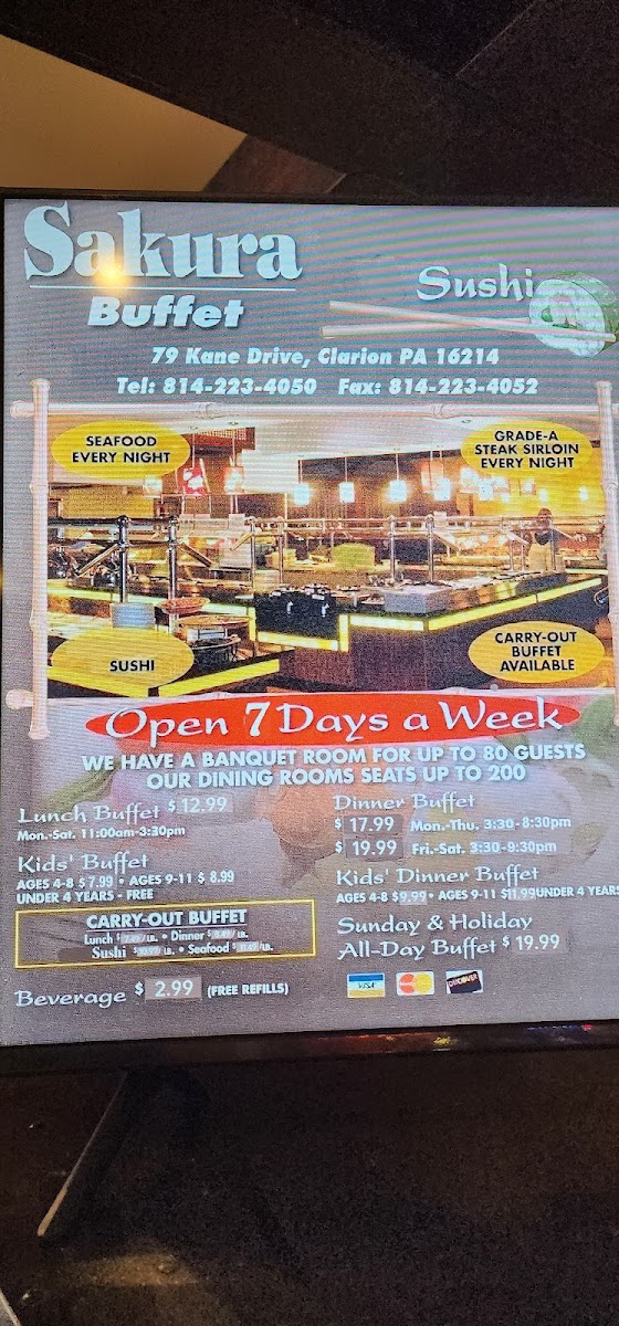 Welcome to Sakura Buffet Clarion, your go-to destination for an exceptional dining experience in Clarion, PA. Located at 79 Kane Dr, this buffet offers an extensive menu that celebrates a variety of cuisines. Beyond the traditional sushi selections, guests can indulge in a myriad of Asian-inspired dishes, each crafted to perfection.
